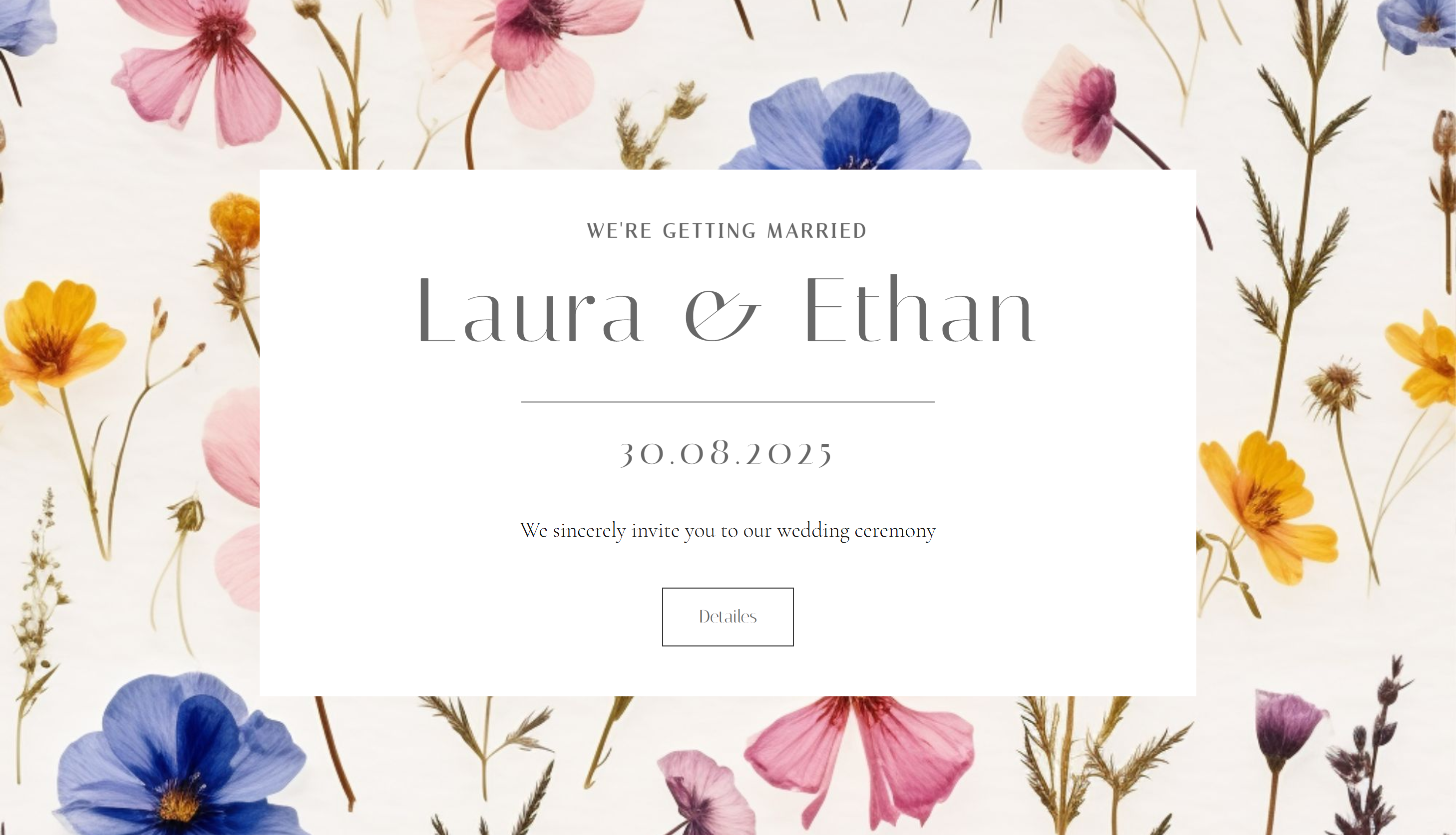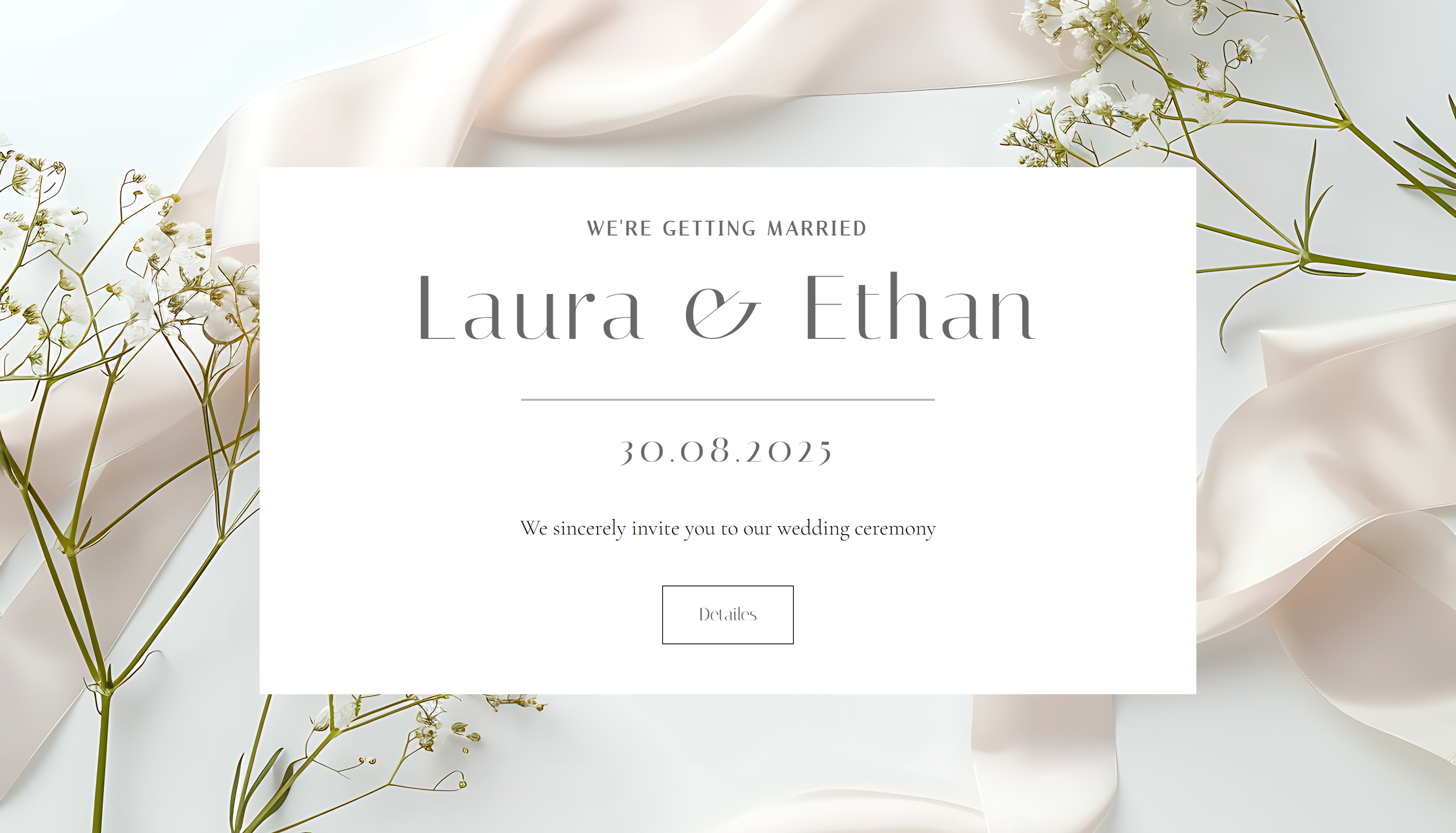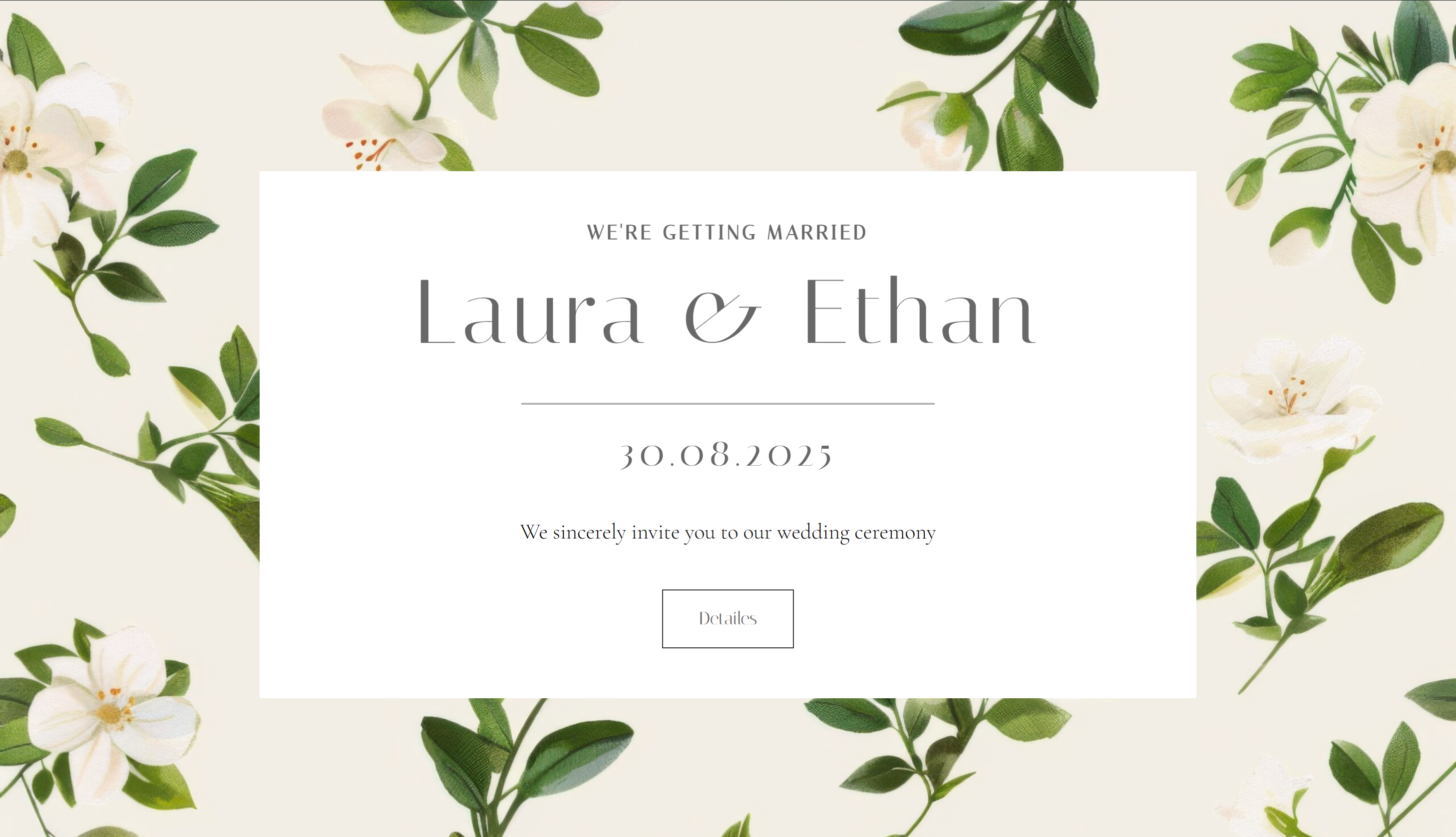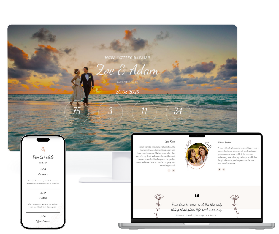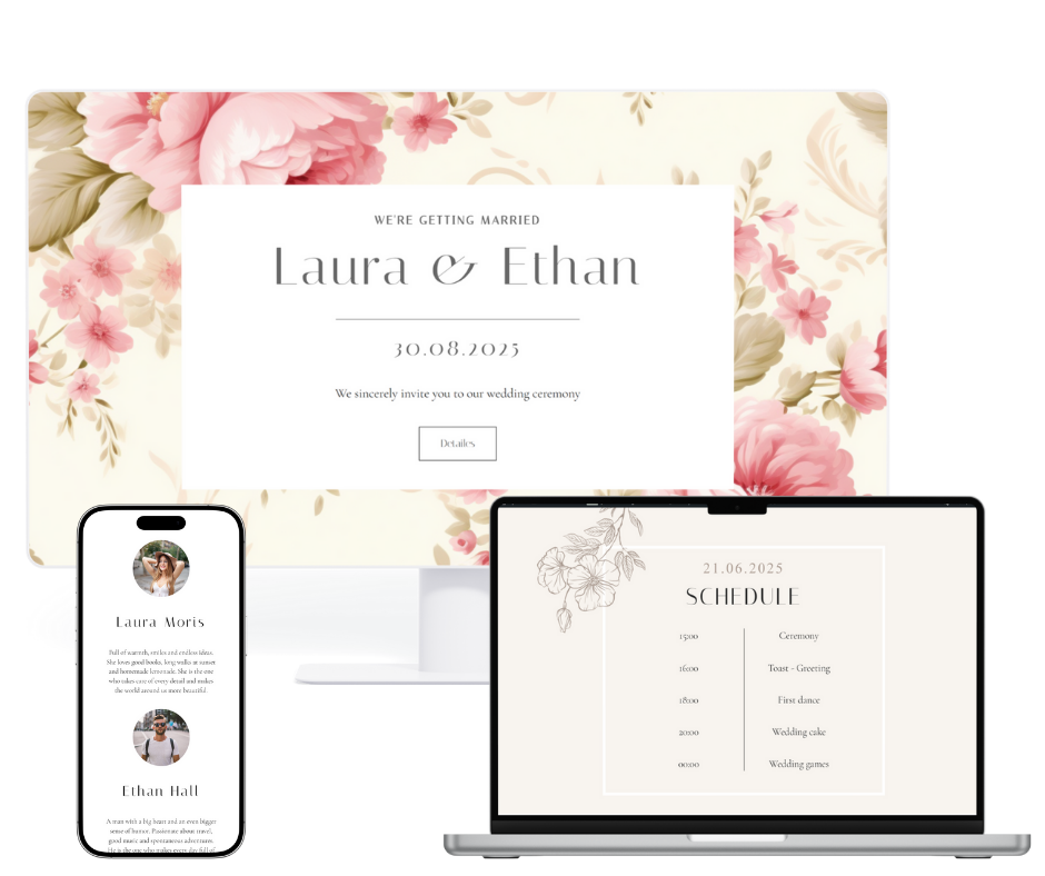 All the most important information about your big day in one place. Guests will find a schedule, location, gift list and photo gallery. Choose a ready-made template and blocks, and we will take care of the rest – ready wedding website in 5 working days!