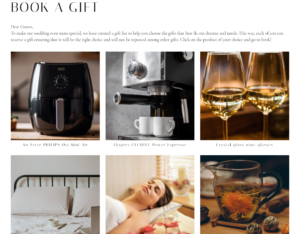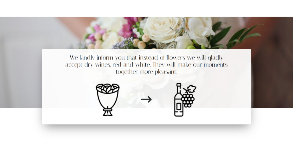 If instead of traditional gifts you prefer, for example, wine, books, donations for your honeymoon or support for a charity of your choice, you can announce it here. The elegant form of the message will allow guests to easily customize their gifts according to your expectations.
