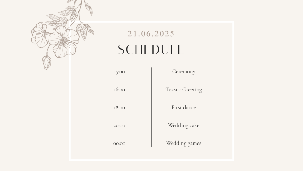 Inform your guests about the wedding by providing a detailed schedule of events. The schedule can include key moments such as the ceremony, welcoming guests, the first dance, serving food or attractions planned for the evening.