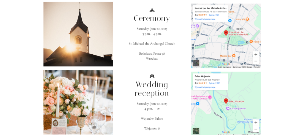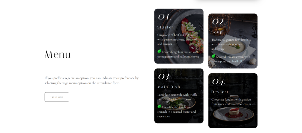 A section where you can share what will be on the wedding table. Main courses, dessert, vege options – all clearly presented so guests know what to expect. This is also the perfect place to add information about allergies or available alternatives.
